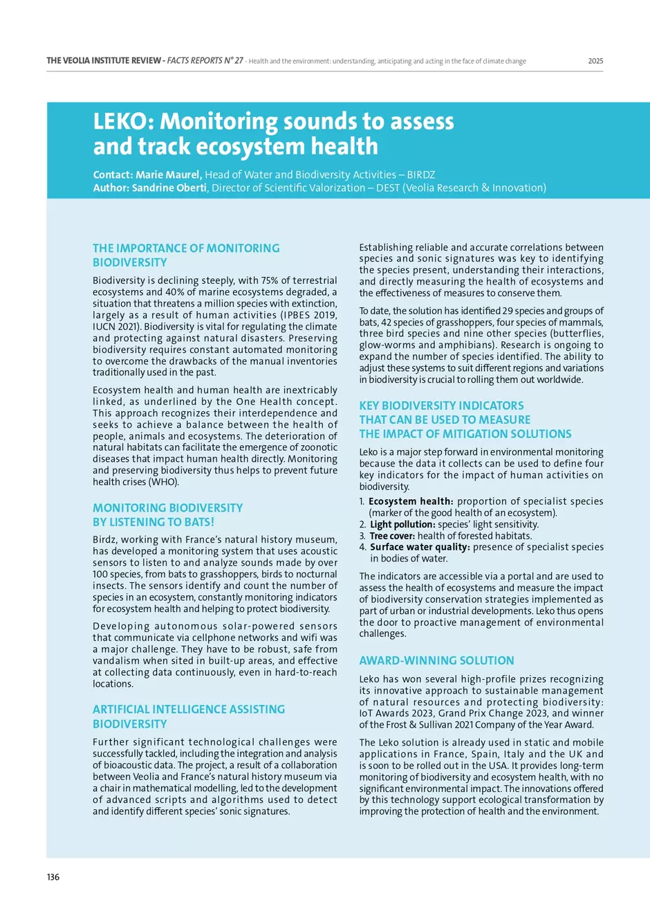 Biodiversity is declining steeply, with 75% of terrestrial ecosystems and 40% of marine ecosystems degraded, a situation that threatens a million species with extinction, largely as a result of human activities (IPBES 2019, IUCN 2021). Biodiversity is vital for regulating the climate and protecting against natural disasters. Preserving biodiversity requires constant automated monitoring to overcome the drawbacks of the manual inventories traditionally used in the past. Ecosystem health and human health are inextricably linked, as underlined by the One Health concept. This approach recognizes their interdependence and seeks to achieve a balance between the health of people, animals and ecosystems. The deterioration of natural habitats can facilitate the emergence of zoonotic diseases that impact human health directly. Monitoring and preserving biodiversity thus helps to prevent future health crises (WHO).