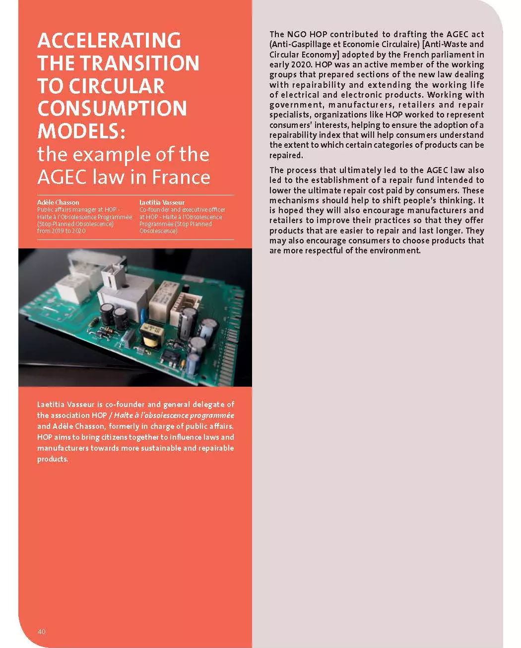 The NGO HOP contributed to drafting the AGEC act (Anti-Gaspillage et Economie Circulaire) [Anti-Waste and Circular Economy] adopted by the French parliament in early 2020. HOP was an active member of the working groups that prepared sections of the new law dealing with repairability and extending the working life of electrical and electronic products. Working with government, manufacturers, retailers and repair specialists, organizations like HOP worked to represent consumers’ interests, helping to ensure the adoption of a repairability index that will help consumers understand the extent to which certain categories of products can be repaired.