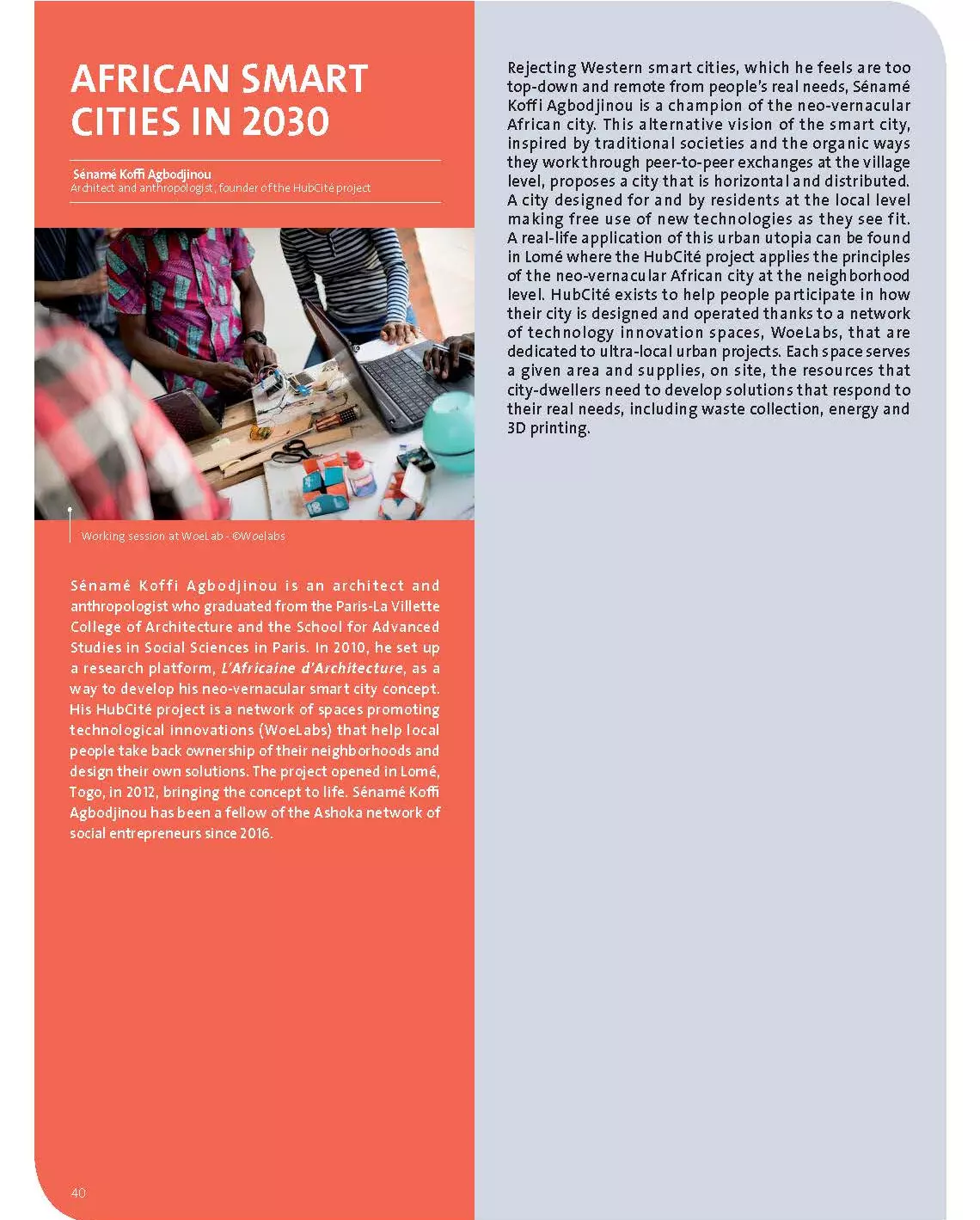 Rejecting Western smart cities, which he feels are too top-down and remote from people’s real needs, Sénamé Koffi Agbodjinou is a champion of the neo-vernacular African city. This alternative vision of the smart city, inspired by traditional societies and the organic ways they work through peer-to-peer exchanges at the village level, proposes a city that is horizontal and distributed.