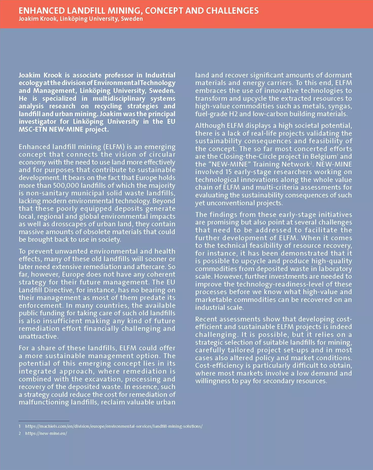 Enhanced landfill mining (ELFM) is an emerging concept that connects the vision of circular economy with the need to use land more effectively and for purposes that contribute to sustainable development. It bears on the fact that Europe holds more than 500,000 landfills of which the majority is non-sanitary municipal solid waste landfills, lacking modern environmental technology.