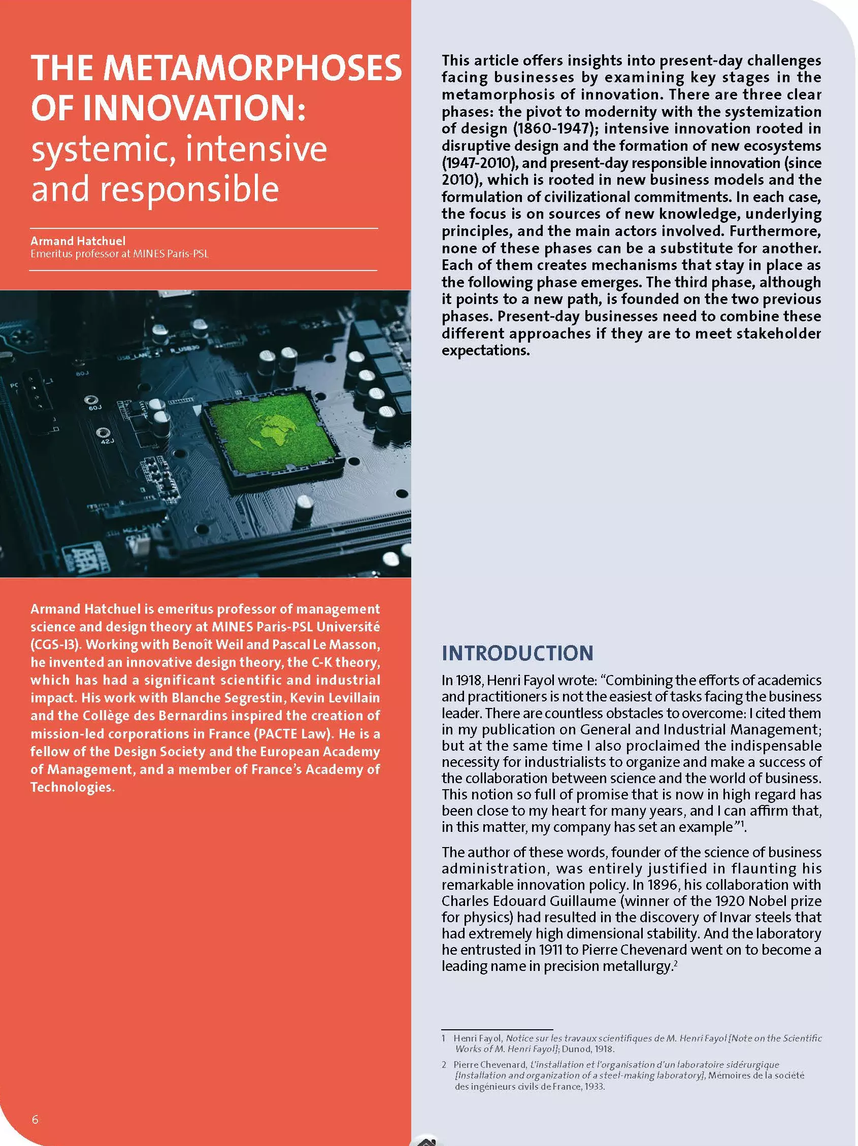 This article offers insights into present-day challenges facing businesses by examining key stages in the metamorphosis of innovation. There are three clear phases: the pivot to modernity with the systemization of design (1860-1947); intensive innovation rooted in disruptive design and the formation of new ecosystems (1947-2010), and present-day responsible innovation (since 2010), which is rooted in new business models and the formulation of civilizational commitments. In each case, the focus is on sources of new knowledge, underlying principles, and the main actors involved. Furthermore, none of these phases can be a substitute for another.