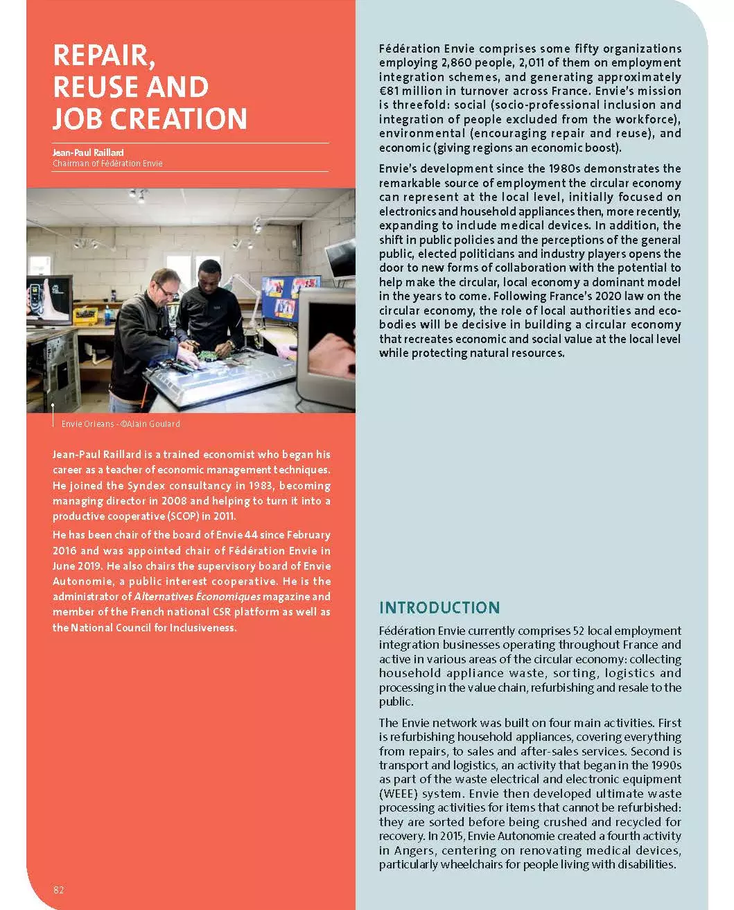 Envie’s development since the 1980s demonstrates the remarkable source of employment the circular economy can represent at the local level, initially focused on electronics and household appliances then, more recently, expanding to include medical devices. In addition, the shift in public policies and the perceptions of the general public, elected politicians and industry players opens the door to new forms of collaboration with the potential to help make the circular, local economy a dominant model in the years to come. Following France’s 2020 law on the circular economy, the role of local authorities and ecobodies will be decisive in building a circular economy that recreates economic and social value at the local level while protecting natural resources.