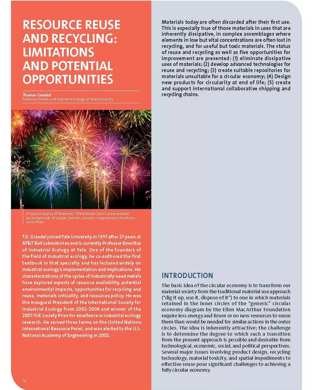The status of reuse and recycling is presented, and five opportunities for improvement are presented: (1) eliminate dissipative uses of materials; (2) develop advanced technologies for reuse and recycling; (3) create suitable repositories for materials unsuitable for a circular economy; (4) design new products for circularity at end of life; (5) create and support international collaborative shipping and recycling chains.