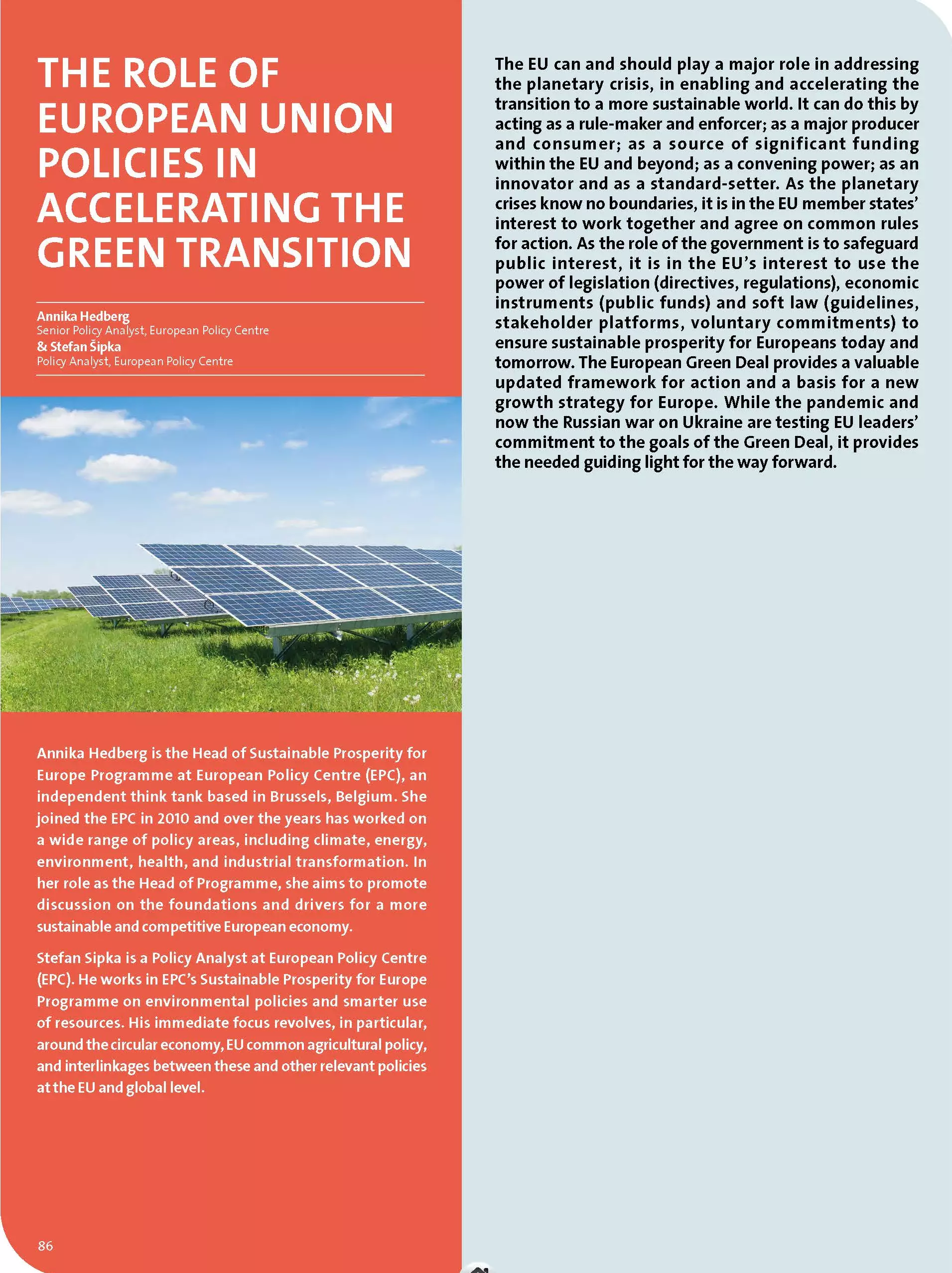 The EU can and should play a major role in addressing the planetary crisis, in enabling and accelerating the transition to a more sustainable world. It can do this by acting as a rule-maker and enforcer; as a major producer and consumer; as a source of significant funding within the EU and beyond; as a convening power; as an innovator and as a standard-setter. As the planetary crises know no boundaries, it is in the EU member states’ interest to work together and agree on common rules for action. As the role of the government is to safeguard public interest, it is in the EU’s interest to use the power of legislation (directives, regulations), economic instruments (public funds) and soft law (guidelines, stakeholder platforms, voluntary commitments) to ensure sustainable prosperity for Europeans today and tomorrow. The European Green Deal provides a valuable updated framework for action and a basis for a new growth strategy for Europe. While the pandemic and now the Russian war on Ukraine are testing EU leaders’ commitment to the goals of the Green Deal, it provides the needed guiding light for the way forward.