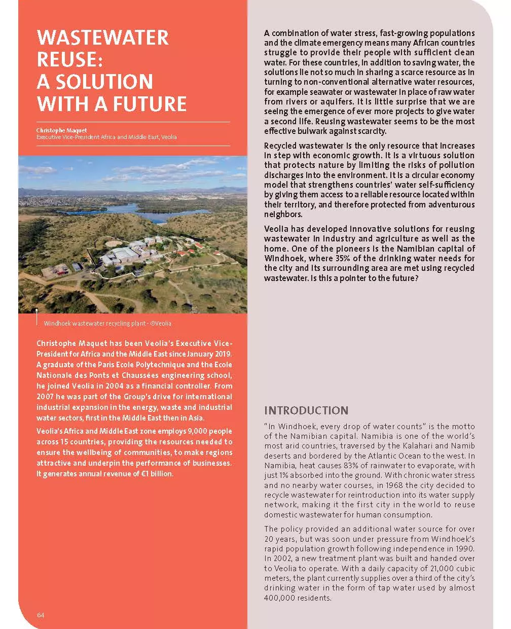 A combination of water stress, fast-growing populations and the climate emergency means many African countries struggle to provide their people with sufficient clean water. For these countries, in addition to saving water, the solutions lie not so much in sharing a scarce resource as in turning to non-conventional alternative water resources, for example seawater or wastewater in place of raw water from rivers or aquifers. It is little surprise that we are seeing the emergence of ever more projects to give water second life. Reusing wastewater seems to be the most eff ective bulwark against scarcity. Recycled wastewater is the only resource that increases in step with economic growth. It is a virtuous solution that protects nature by limiting the risks of pollution discharges into the environment. It is a circular economy model that strengthens countries’ water self-suffi ciency y giving them access to a reliable resource located within their territory, and therefore protected from adventurous neighbors.