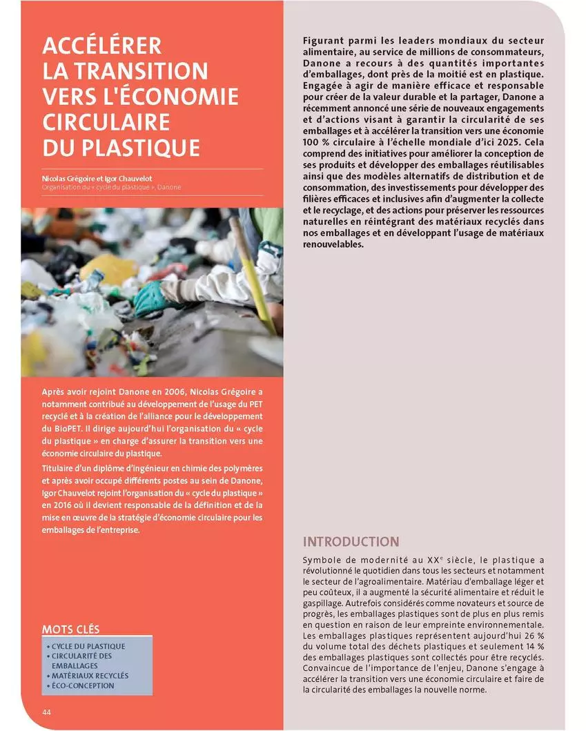 Figurant parmi les leaders mondiaux du secteur alimentaire, au service de millions de consommateurs, Danone a recours à des quantités importantes d’emballages, dont près de la moitié est en plastique. Engagée à agir de manière efficace et responsable pour créer de la valeur durable et la partager, Danone a récemment annoncé une série de nouveaux engagements et d’actions visant à garantir la circularité de ses emballages et à accélérer la transition vers une économie 100 % circulaire à l’échelle mondiale d’ici 2025. Cela comprend des initiatives pour améliorer la conception de ses produits et développer des emballages réutilisables ainsi que des modèles alternatifs de distribution et de consommation, des investissements pour développer des filières efficaces et inclusives afin d’augmenter la collecte et le recyclage, et des actions pour préserver les ressources naturelles en réintégrant des matériaux recyclés dans nos emballages et en développant l’usage de matériaux renouvelables.
