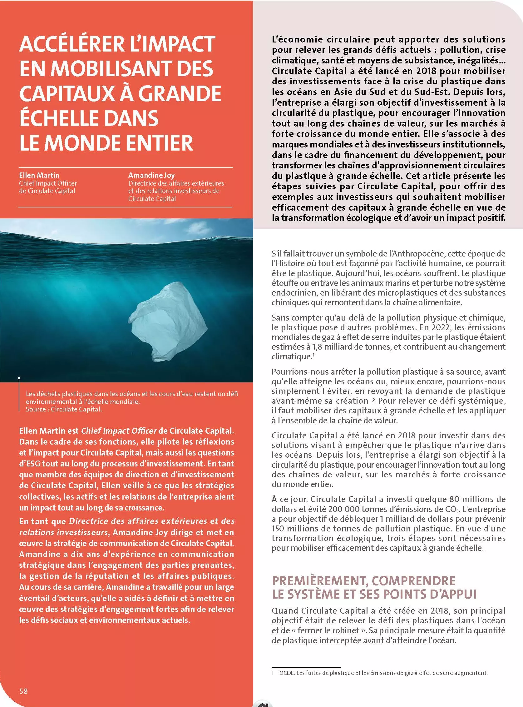 Cet article présente les étapes suivies par Circulate Capital, pour offrir des exemples aux investisseurs qui souhaitent mobiliser efficacement des capitaux à grande échelle en vue de la transformation écologique et d’avoir un impact positif.