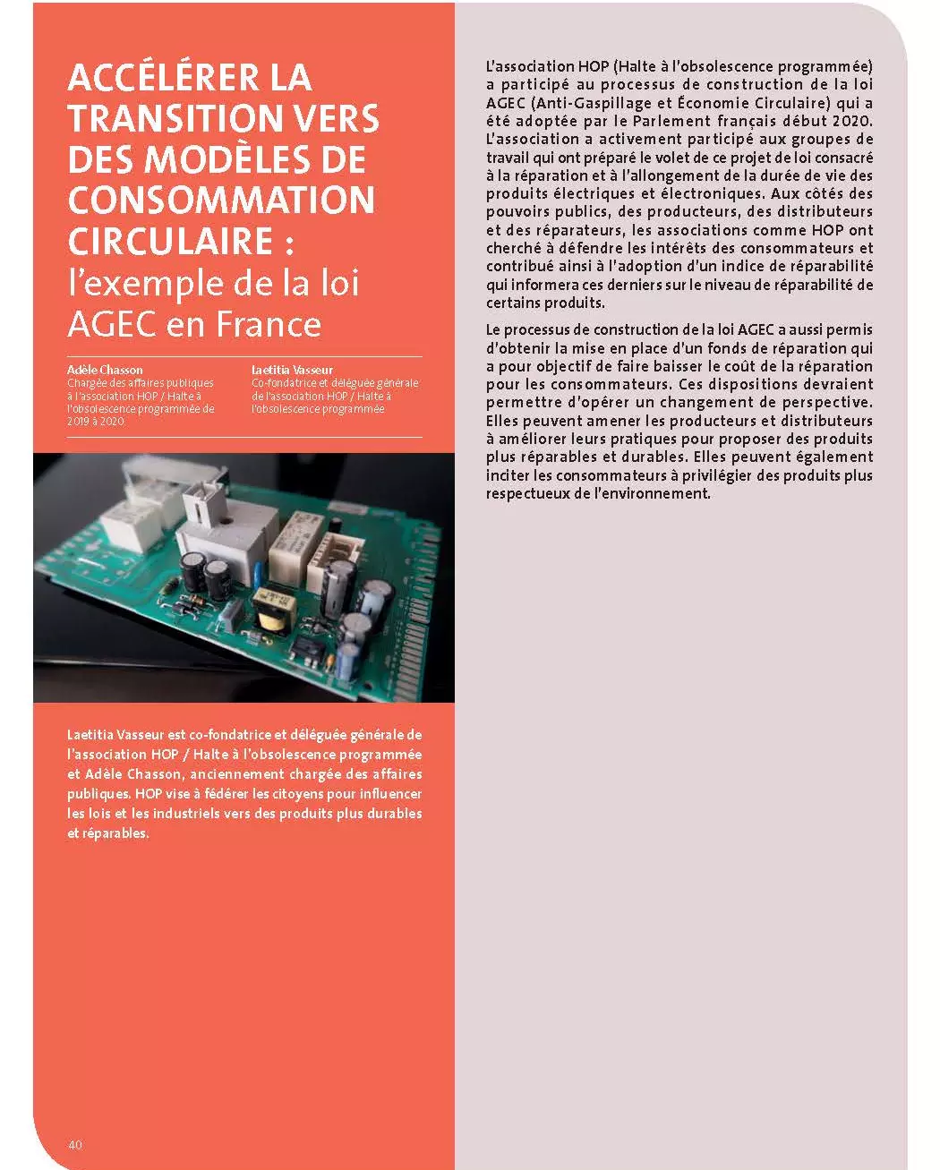 L’association HOP (Halte à l’obsolescence programmée) a participé au processus de construction de la loi AGEC (Anti-Gaspillage et Économie Circulaire) qui a été adoptée par le Parlement français début 2020. L’association a activement participé aux groupes de travail qui ont préparé le volet de ce projet de loi consacré à la réparation et à l’allongement de la durée de vie des produits électriques et électroniques. Aux côtés des pouvoirs publics, des producteurs, des distributeurs et des réparateurs, les associations comme HOP ont cherché à défendre les intérêts des consommateurs et contribué ainsi à l’adoption d’un indice de réparabilité qui informera ces derniers sur le niveau de réparabilité de certains produits.