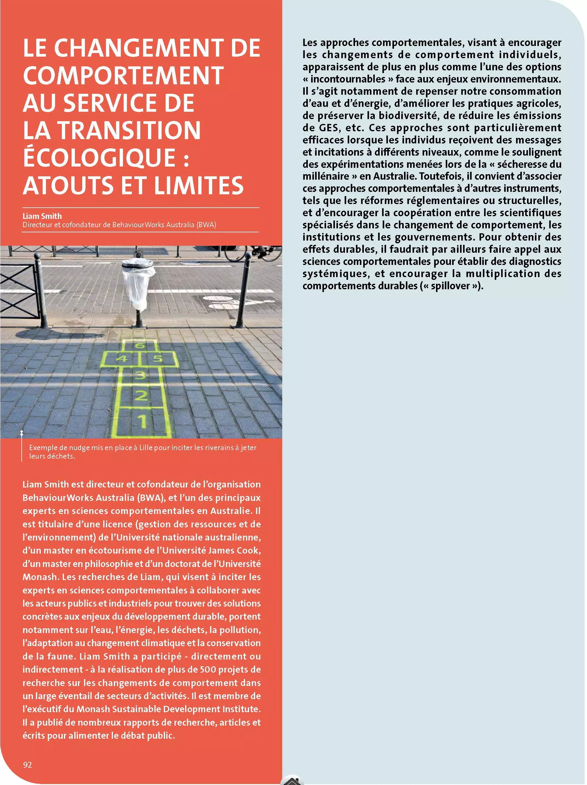 Les approches comportementales, visant à encourager les changements de comportement individuels, apparaissent de plus en plus comme l’une des options « incontournables » face aux enjeux environnementaux. Il s’agit notamment de repenser notre consommation d’eau et d’énergie, d’améliorer les pratiques agricoles, de préserver la biodiversité, de réduire les émissions de GES, etc. Ces approches sont particulièrement efficaces lorsque les individus reçoivent des messages et incitations à différents niveaux, comme le soulignent des expérimentations menées lors de la « sécheresse du millénaire » en Australie.