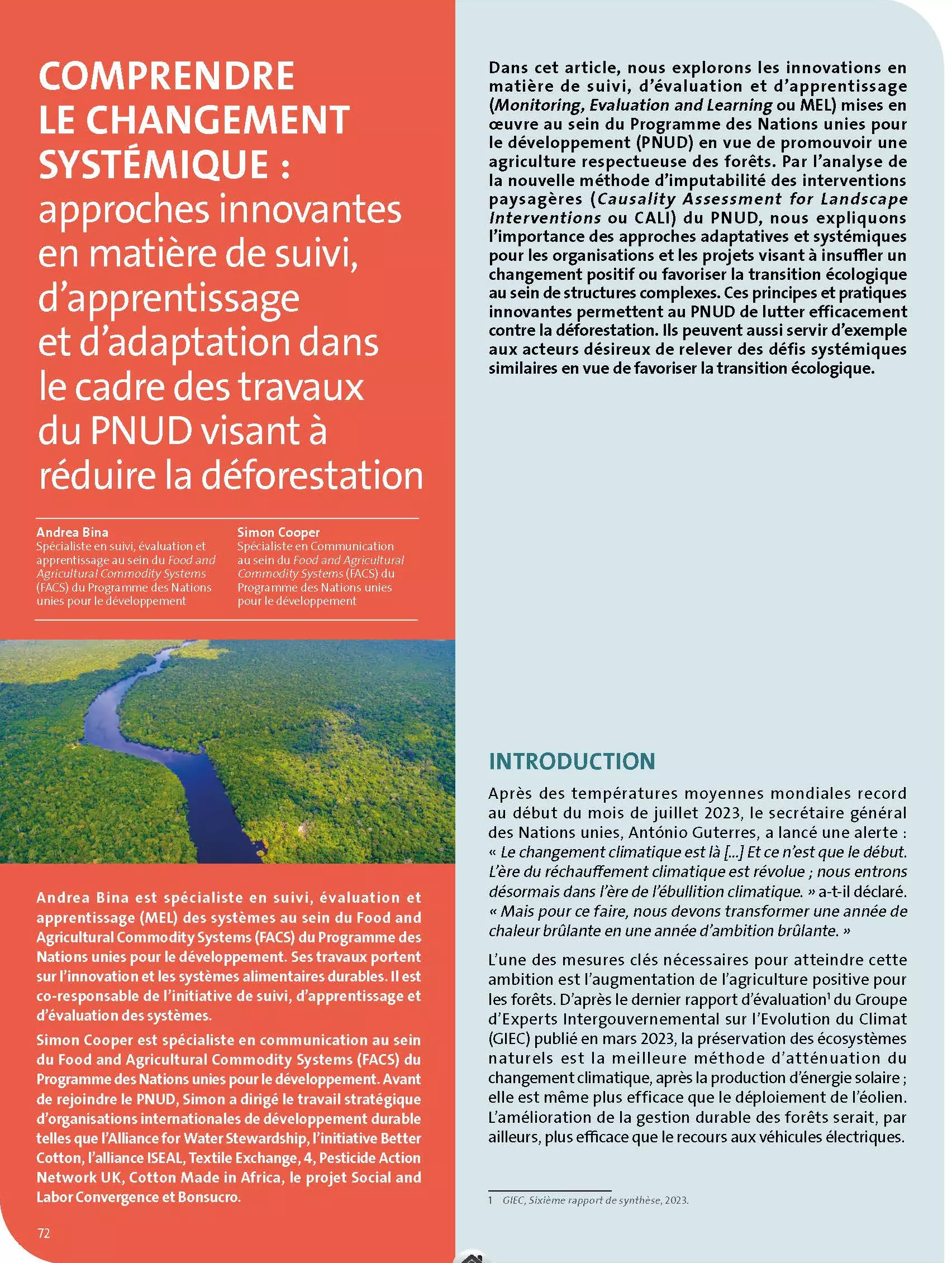 Par l’analyse de la nouvelle méthode d’imputabilité des interventions paysagères (Causality Assessment for Landscape Interventions ou CALI) du PNUD, nous expliquons l’importance des approches adaptatives et systémiques pour les organisations et les projets visant à insuffler un changement positif ou favoriser la transition écologique au sein de structures complexes. Ces principes et pratiques innovantes permettent au PNUD de lutter efficacement contre la déforestation. Ils peuvent aussi servir d’exemple aux acteurs désireux de relever des défis systémiques similaires en vue de favoriser la transition écologique.
