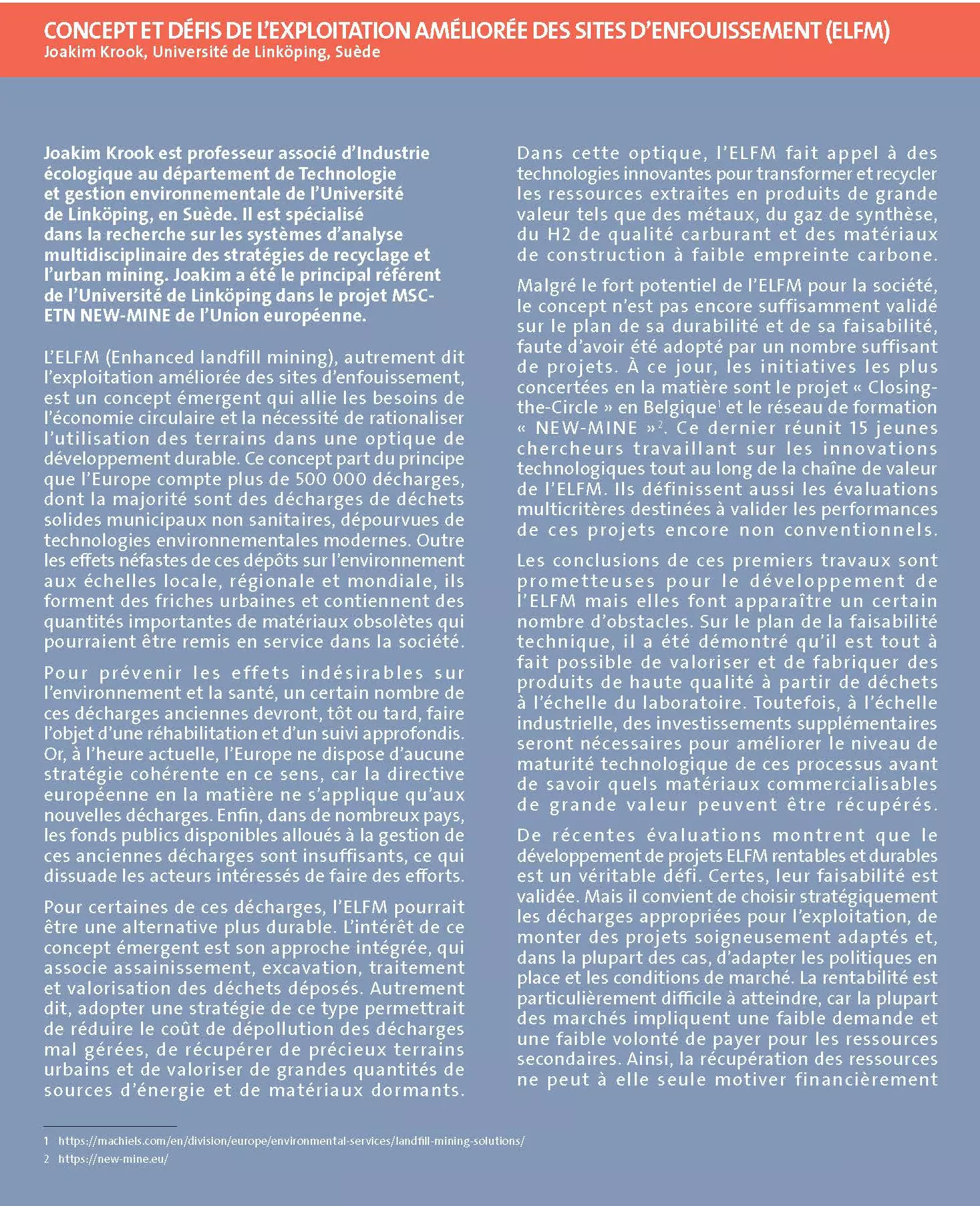 L’ELFM (Enhanced landfill mining), autrement dit l’exploitation améliorée des sites d’enfouissement, est un concept émergent qui allie les besoins de l’économie circulaire et la nécessité de rationaliser l’utilisation des terrains dans une optique de développement durable. Ce concept part du principe que l’Europe compte plus de 500 000 décharges, dont la majorité sont des décharges de déchets solides municipaux non sanitaires, dépourvues de technologies environnementales modernes.