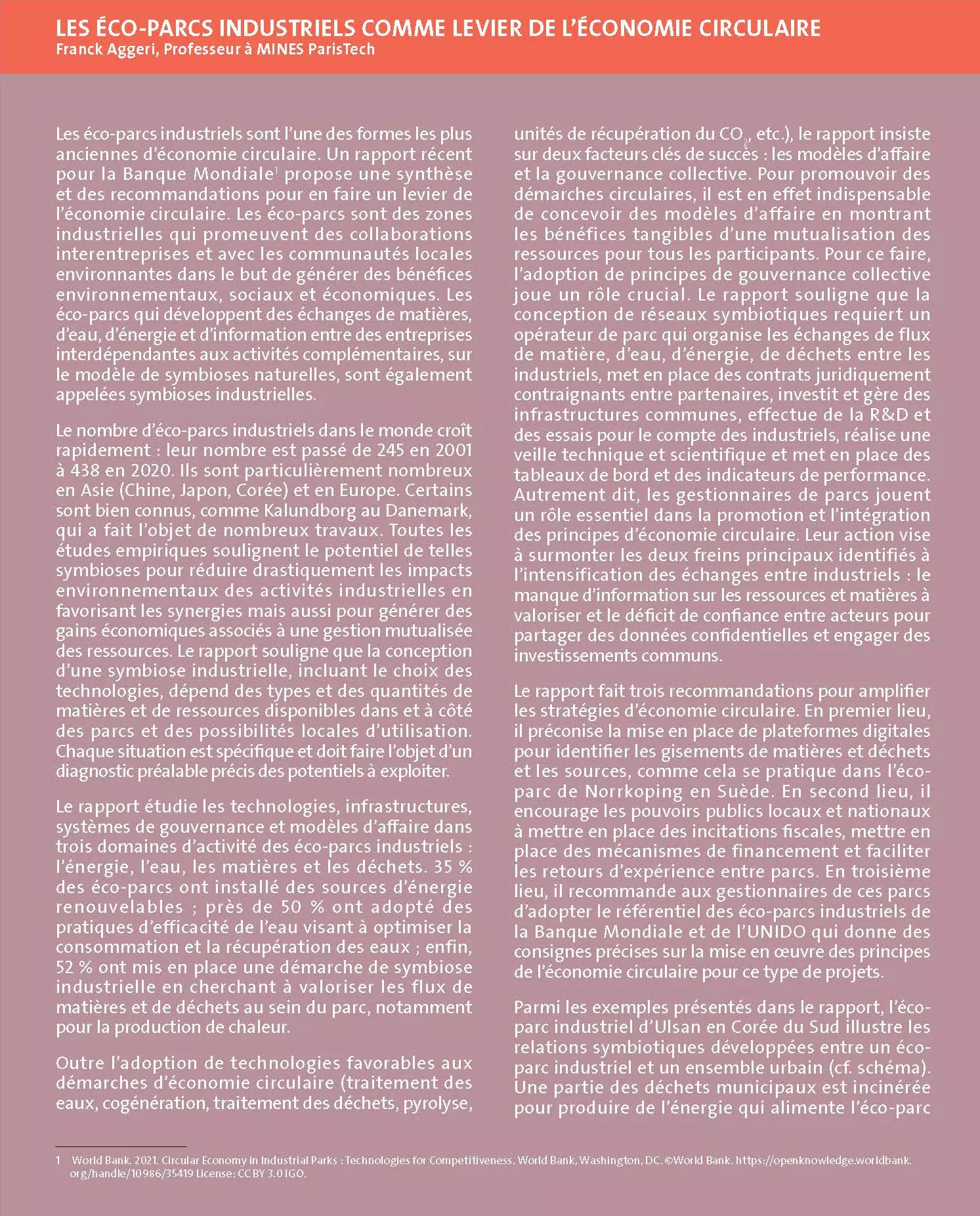 Le nombre d’éco-parcs industriels dans le monde croît rapidement : leur nombre est passé de 245 en 2001 à 438 en 2020. Ils sont particulièrement nombreux en Asie (Chine, Japon, Corée) et en Europe. Certains sont bien connus, comme Kalundborg au Danemark, qui a fait l’objet de nombreux travaux. Toutes les études empiriques soulignent le potentiel de telles symbioses pour réduire drastiquement les impacts environnementaux des activités industrielles en favorisant les synergies mais aussi pour générer des gains économiques associés à une gestion mutualisée des ressources. Le rapport souligne que la conception d’une symbiose industrielle, incluant le choix des technologies, dépend des types et des quantités de matières et de ressources disponibles dans et à côté des parcs et des possibilités locales d’utilisation. Chaque situation est spécifique et doit faire l’objet d’un diagnostic préalable précis des potentiels à exploiter.