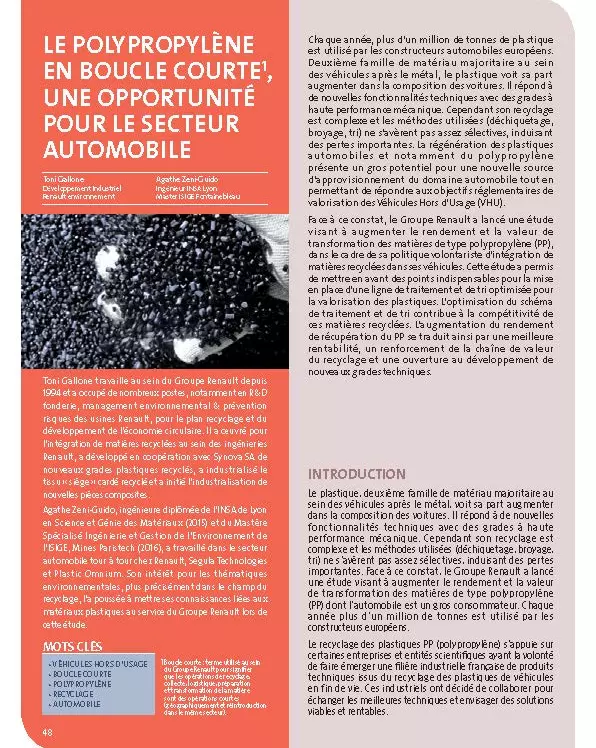Chaque année, plus d’un million de tonnes de plastique est utilisé par les constructeurs automobiles européens. Deuxième famille de matériau majoritaire au sein des véhicules après le métal, le plastique voit sa part augmenter dans la composition des voitures. Il répond à de nouvelles fonctionnalités techniques avec des grades à haute performance mécanique. Cependant son recyclage est complexe et les méthodes utilisées (déchiquetage, broyage, tri) ne s’avèrent pas assez sélectives, induisant des pertes importantes. La régénération des plastiques automobiles et notamment du polypropylène présente un gros potentiel pour une nouvelle source d’approvisionnement du domaine automobile tout en