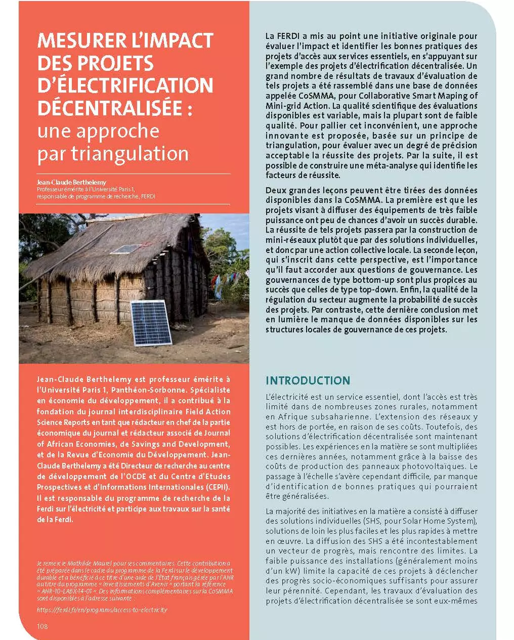 La FERDI a mis au point une initiative originale pour évaluer l’impact et identifier les bonnes pratiques des projets d’accès aux services essentiels, en s’appuyant sur l’exemple des projets d’électrification décentralisée. Un grand nombre de résultats de travaux d’évaluation de tels projets a été rassemblé dans une base de données appelée CoSMMA, pour Collaborative Smart Maping of Mini-grid Action. La qualité scientifique des évaluations disponibles est variable, mais la plupart sont de faible qualité. Pour pallier cet inconvénient, une approche innovante est proposée, basée sur un principe de triangulation, pour évaluer avec un degré de précision acceptable la réussite des projets. Par la suite, il est possible de construire une méta-analyse qui identifie les facteurs de réussite.