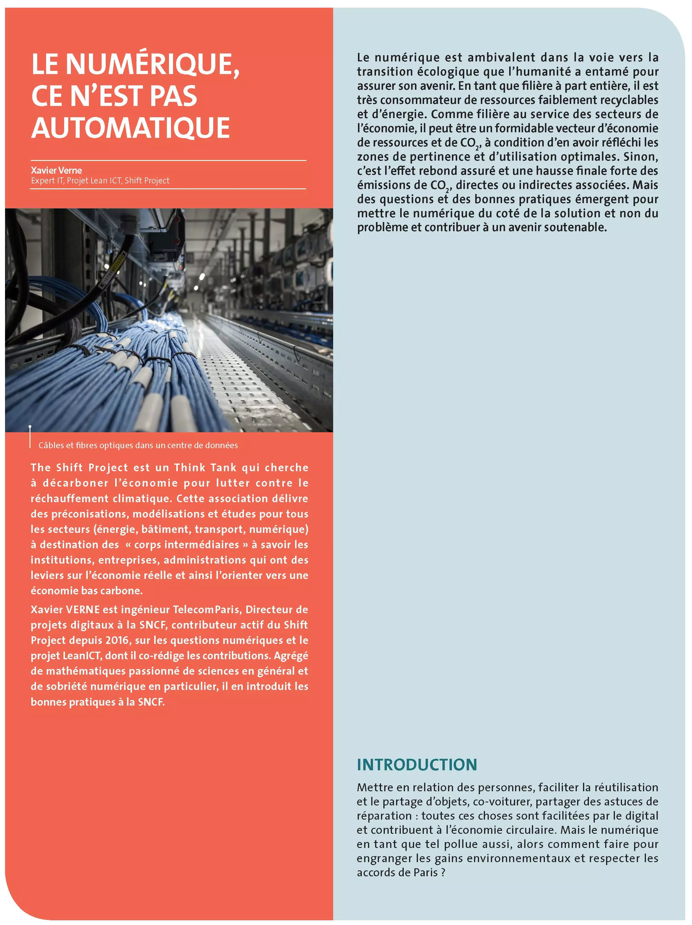 En tant que filière à part entière, le numérique est très consommateur de ressources faiblement recyclables et d’énergie. Comme filière au service des secteurs de l’économie, il peut être un formidable vecteur d’économie de ressources et de CO2, à condition d’en avoir réfléchi les zones de pertinence et d’utilisation optimales. Sinon, c’est l’effet rebond assuré et une hausse finale forte des émissions de CO2, directes ou indirectes associées.