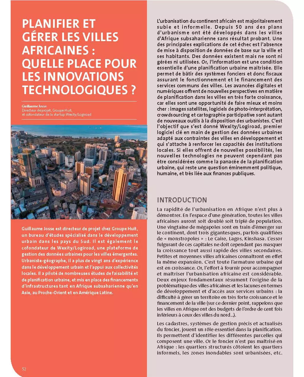 Les avancées digitales et numériques offrent de nouvelles perspectives en matière de planification dans les villes en très forte croissance, car elles sont une opportunité de faire mieux et moins cher : images satellites, logiciels de photo-interprétation, crowdsourcing et cartographie participative sont autant de nouveaux outils à la disposition des urbanistes. C’est l’objectif que s’est donné Wexity/Logiroad, premier logiciel clé en main de gestion des données urbaines adapté aux contraintes des villes en développement et qui s’attache à renforcer les capacités des institutions locales. Si elles offrent de nouvelles possibilités, les nouvelles technologies ne peuvent cependant pas être considérées comme la panacée de la planification urbaine, qui reste une question éminemment politique, humaine, et très liée aux finances publiques.
