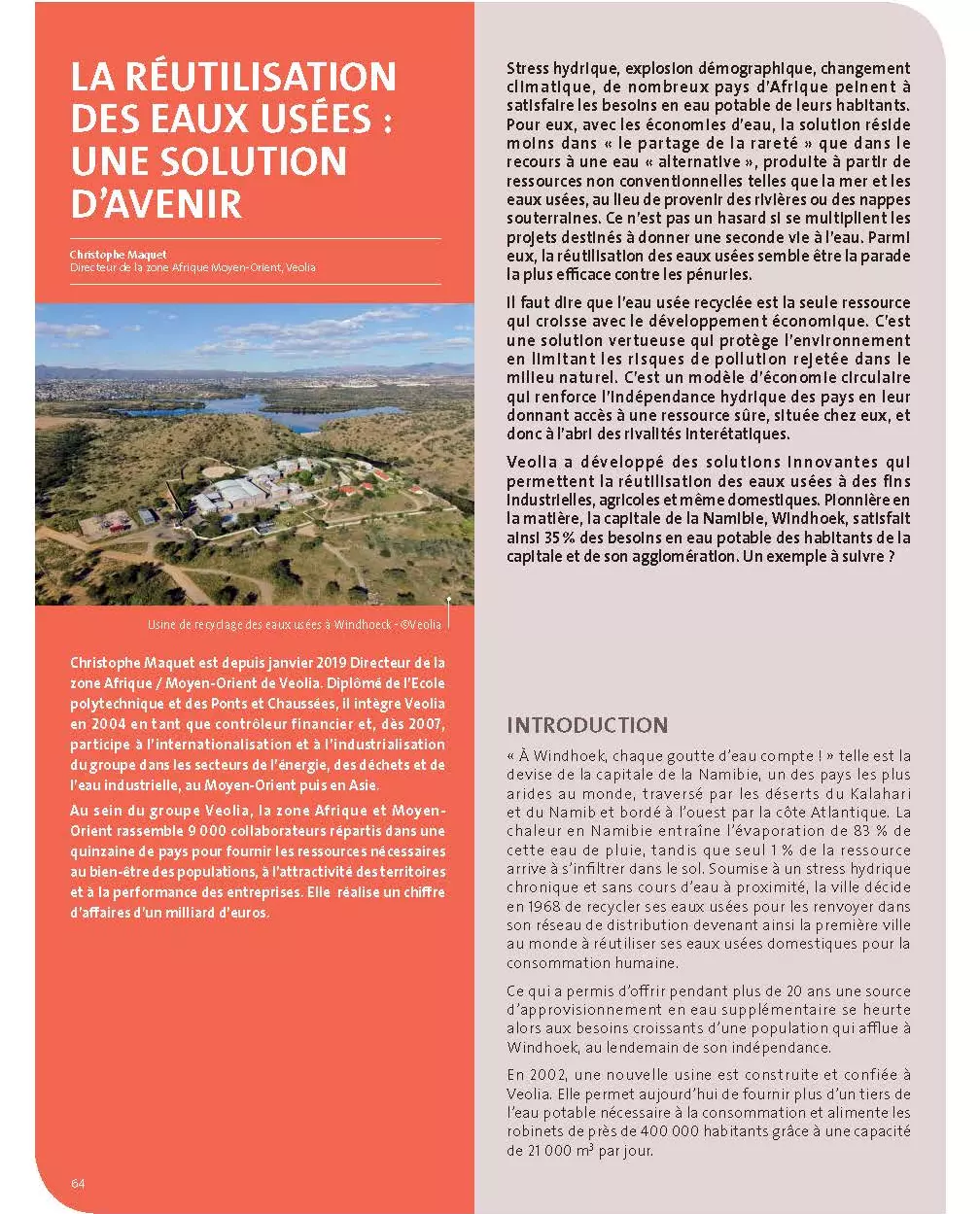 Veolia a développé des solutions innovantes qui permettent la réutilisation des eaux usées à des fins industrielles, agricoles et même domestiques. Pionnière en la matière, la capitale de la Namibie, Windhoek, satisfait ainsi 35 % des besoins en eau potable des habitants de la capitale et de son agglomération. Un exemple à suivre ?