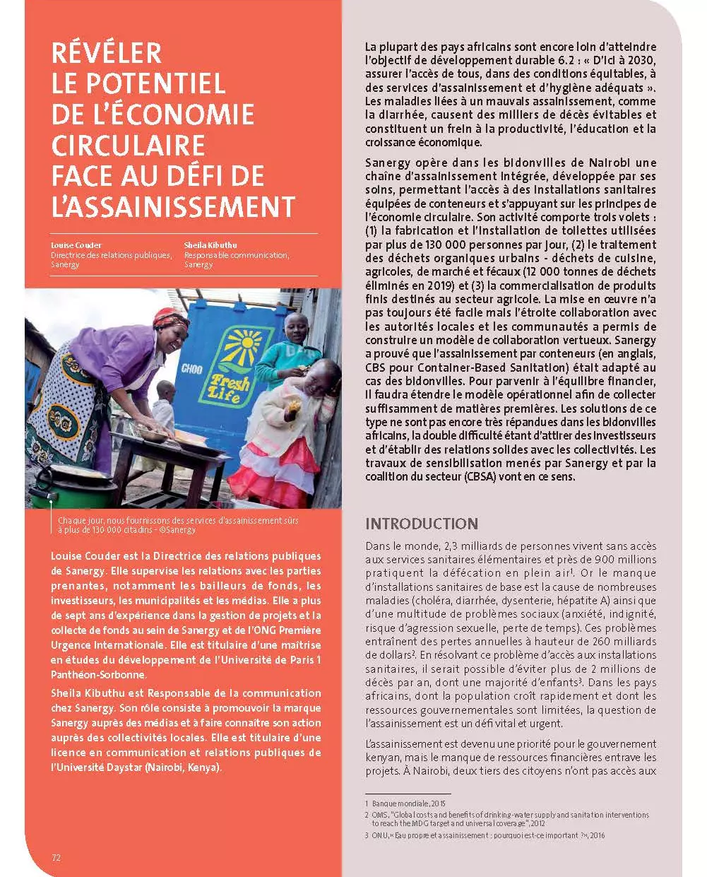 Sanergy opère dans les bidonvilles de Nairobi une chaîne d’assainissement intégrée, développée par ses soins, permettant l’accès à des installations sanitaires équipées de conteneurs et s’appuyant sur les principes de l’économie circulaire. Son activité comporte trois volets : (1) la fabrication et l’installation de toilettes utilisées par plus de 130 000 personnes par jour, (2) le traitement des déchets organiques urbains - déchets de cuisine, agricoles, de marché et fécaux (12 000 tonnes de déchets éliminés en 2019) et (3) la commercialisation de produits finis destinés au secteur agricole. La mise en oeuvre n’a pas toujours été facile mais l’étroite collaboration avec les autorités locales et les communautés a permis de construire un modèle de collaboration vertueux. Sanergy a prouvé que l’assainissement par conteneurs (en anglais, CBS pour Container-Based Sanitation) était adapté au cas des bidonvilles. Pour parvenir à l’équilibre financier, il faudra étendre le modèle opérationnel afin de collecter suffisamment de matières premières. Les solutions de ce type ne sont pas encore très répandues dans les bidonvilles africains, la double difficulté étant d’attirer des investisseurs et d’établir des relations solides avec les collectivités. Les travaux de sensibilisation menés par Sanergy et par la coalition du secteur (CBSA) vont en ce sens.