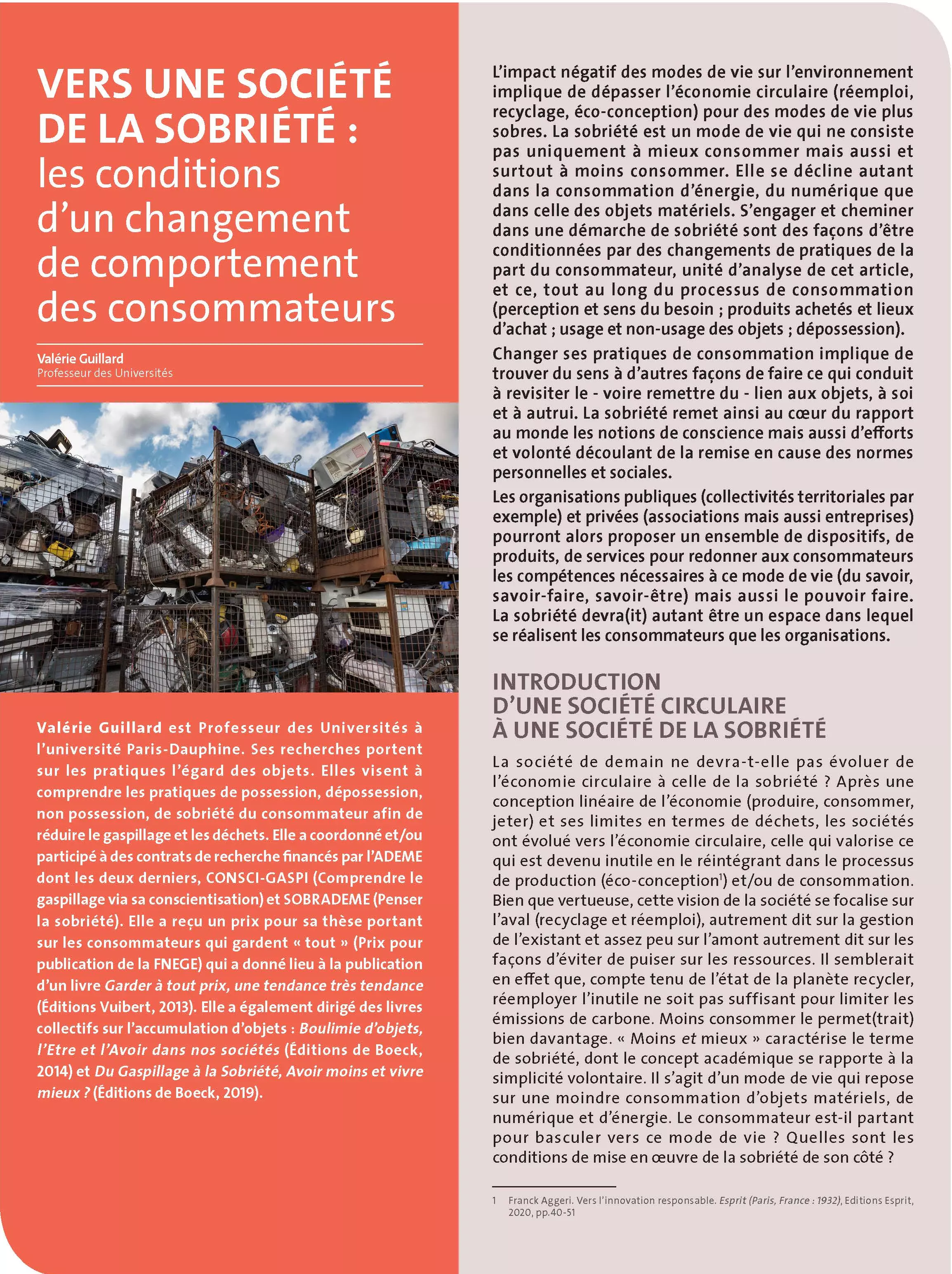 L’impact négatif des modes de vie sur l’environnement implique de dépasser l’économie circulaire (réemploi, recyclage, éco-conception) pour des modes de vie plus sobres. La sobriété est un mode de vie qui ne consiste pas uniquement à mieux consommer mais aussi et surtout à moins consommer. Elle se décline autant dans la consommation d’énergie, du numérique que dans celle des objets matériels. S’engager et cheminer dans une démarche de sobriété sont des façons d’être conditionnées par des changements de pratiques de la part du consommateur, unité d’analyse de cet article, et ce, tout au long du processus de consommation (perception et sens du besoin ; produits achetés et lieux d’achat ; usage et non-usage des objets ; dépossession).