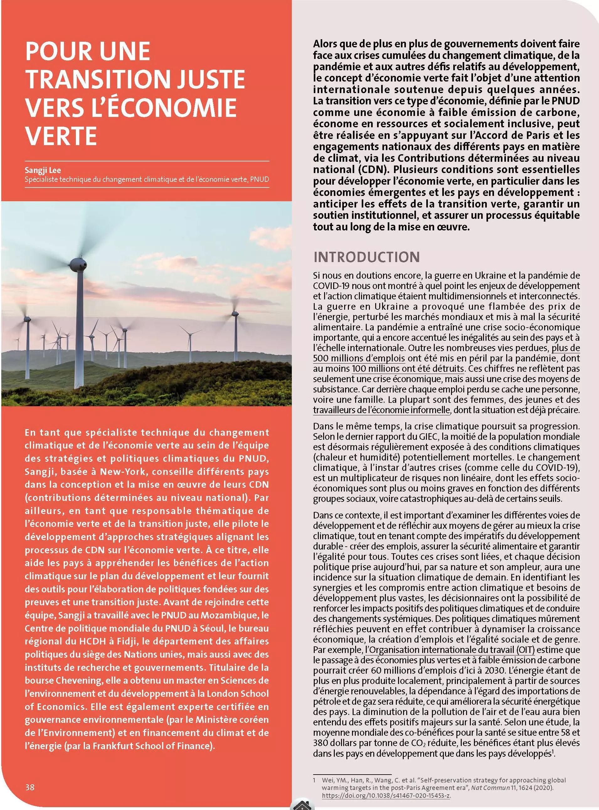 La transition vers ce type d’économie, définie par le PNUD comme une économie à faible émission de carbone, économe en ressources et socialement inclusive, peut être réalisée en s’appuyant sur l’Accord de Paris et les engagements nationaux des différents pays en matière de climat, via les Contributions déterminées au niveau national (CDN).