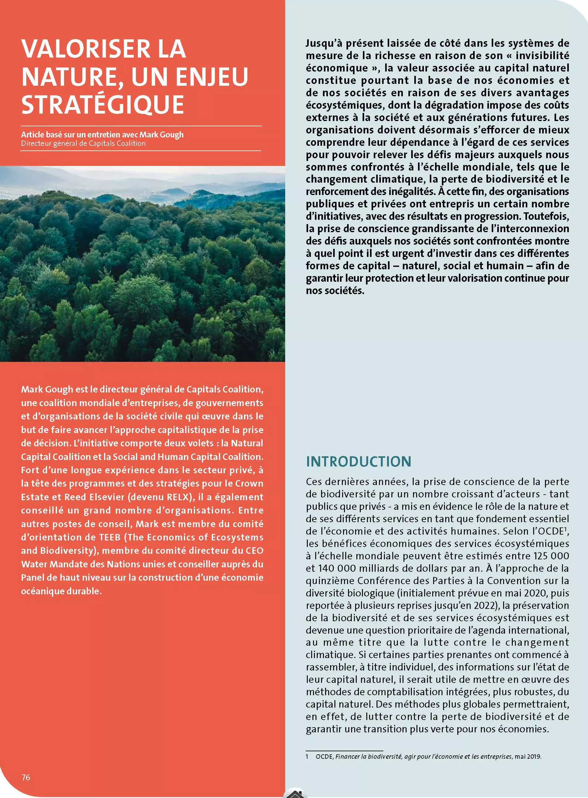 À cette fin, des organisations publiques et privées ont entrepris un certain nombre d’initiatives, avec des résultats en progression. Toutefois, la prise de conscience grandissante de l’interconnexion des défis auxquels nos sociétés sont confrontées montre à quel point il est urgent d’investir dans ces différentes formes de capital – naturel, social et humain – afin de garantir leur protection et leur valorisation continue pour nos sociétés.